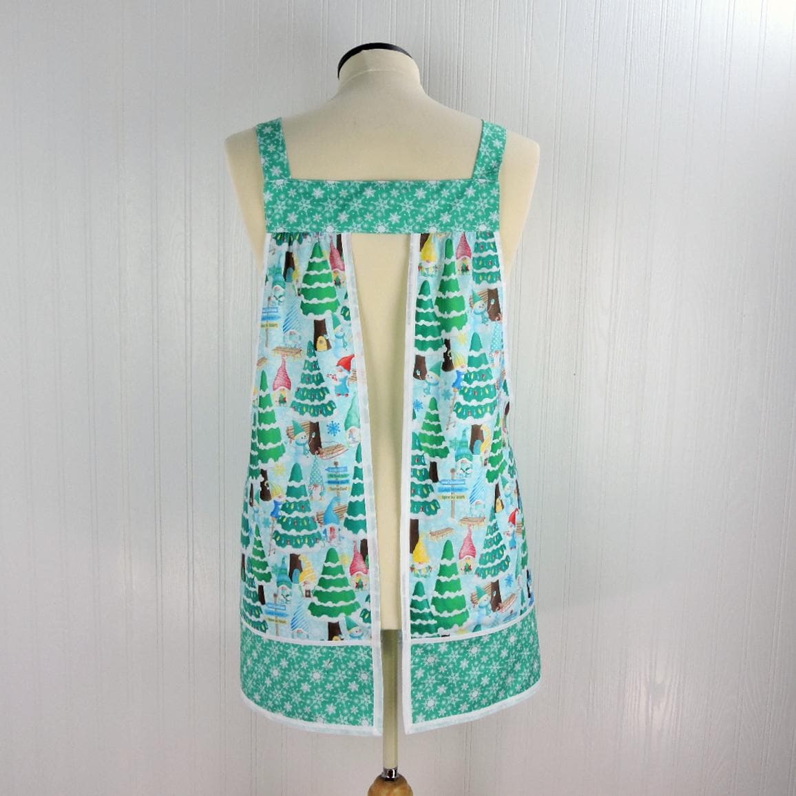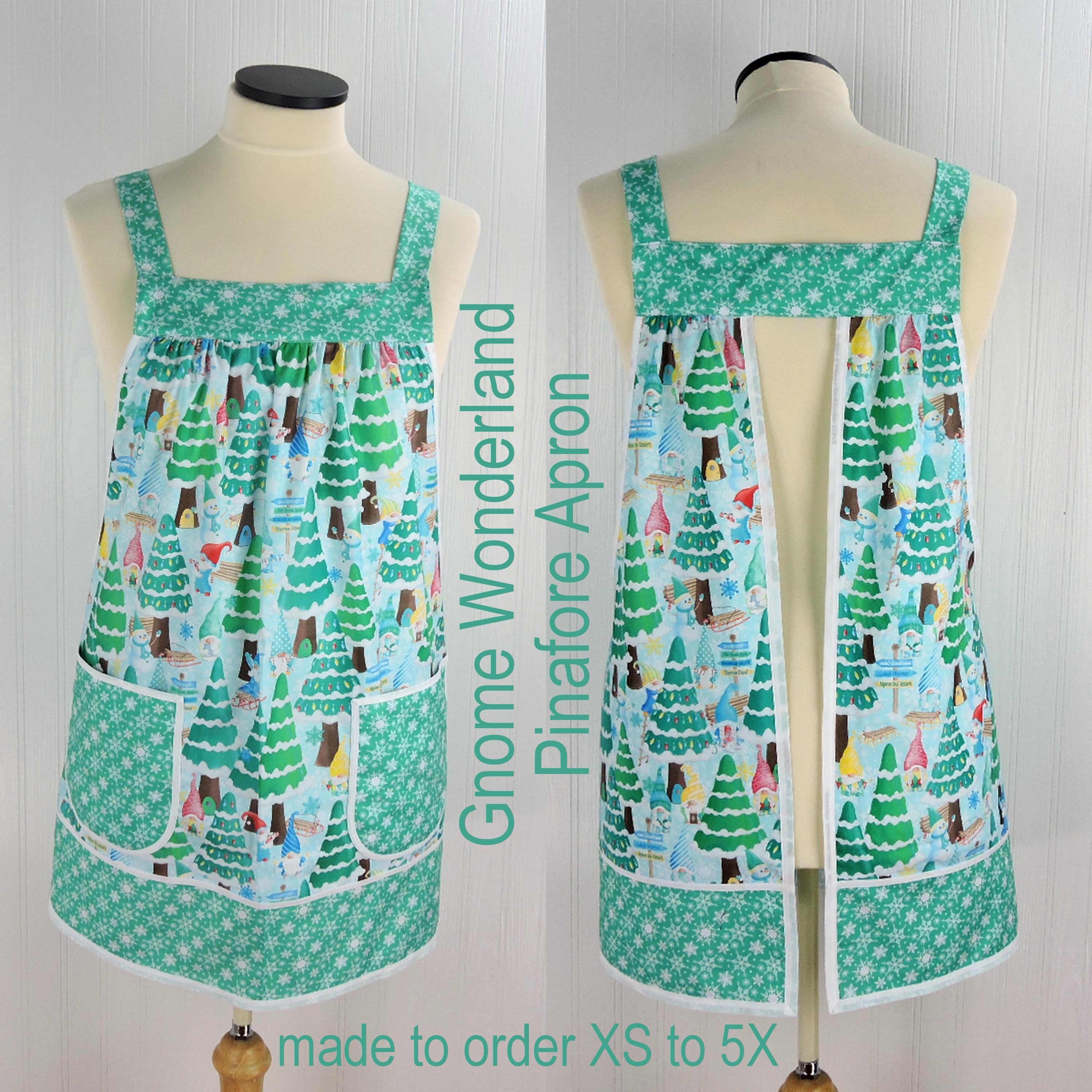 Lovely Christmas-themed Pinafore Apron features fabrics from the Benartex Gnome Wonderland collection. The apron is specially designed to be so easy to put on and take off using no ties, buttons, or fasteners of any kind. No gymnastics are required to don the apron! Simply slip the apron over your head like a t-shirt and slide your arms into the generous openings to put it on. The apron rests totally on the shoulders, placing no strain on the neck. Extremely comfortable for all-day wear! Apron fully covers your clothing for protection while you are working around the house, but is completely split up the back (to the band at the top) to allow freedom of movement. Armholes are bound with a coordinating bias binding for extra strength and durability. Extra-large patch pockets are so handy for many purposes. The apron is gathered in front and back, where it attaches at the top bands and fits many sizes due to its unique style-- certainly roomy enough for many plus sizes. Also great for expectant moms! (Standard size apron is shown above on a size 16 dress form.) Loose-fitting and very comfortable style to wear. Makes a great gift for the cooking/baking enthusiast on your gift list-- or for a very special treat for yourself! Great care and attention are paid when I make these aprons-- there are no exposed seams or raw edges showing on my aprons! All seams are neatly enclosed for a sturdier and longer-lasting finished product.