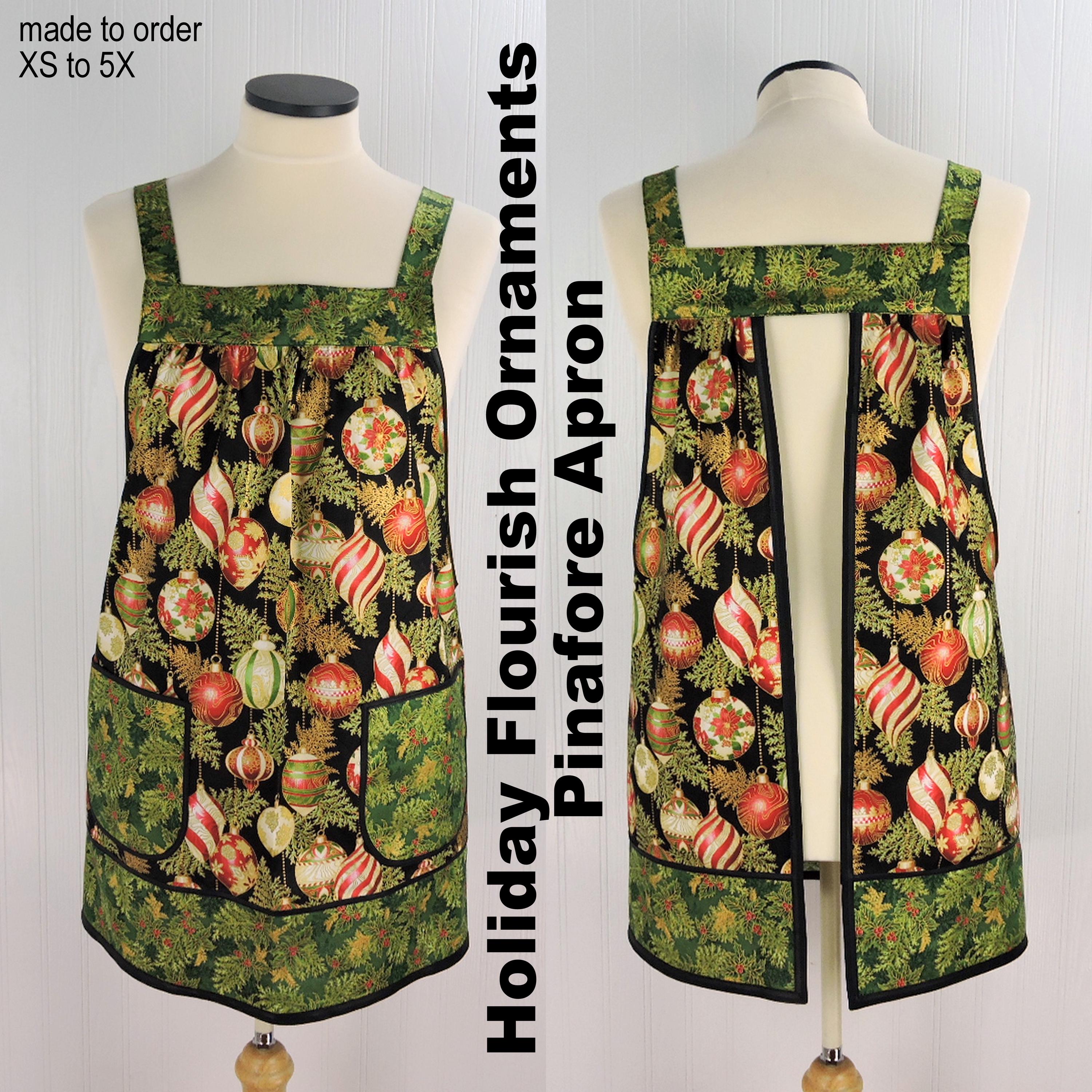 XS- 5X Holiday Flourish Ornaments Pinafore with no ties (straps go straight over the shoulders) relaxed fit smock with pockets made to order