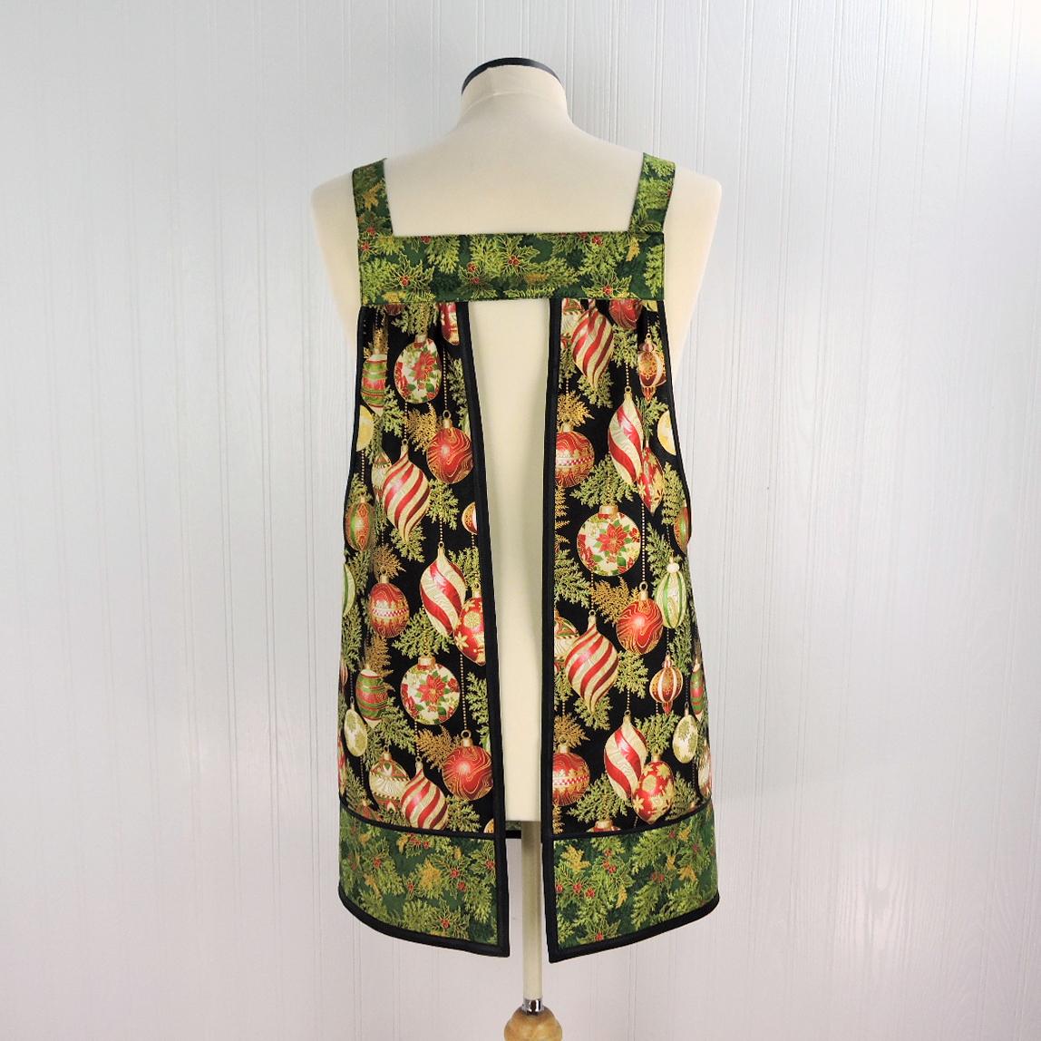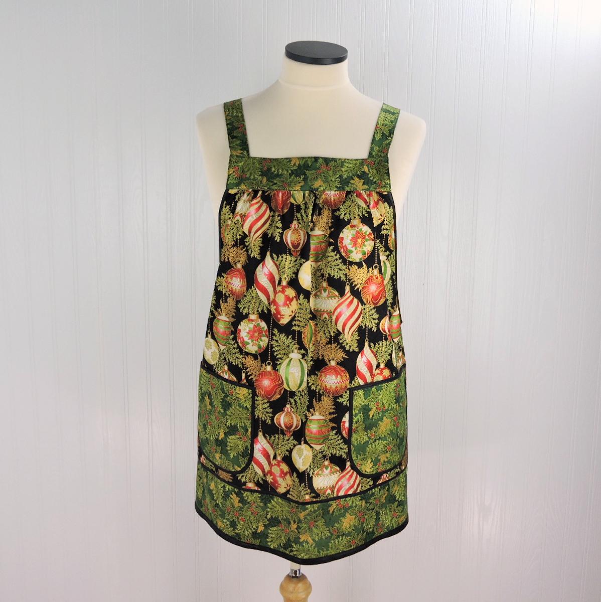 The pinafore apron is specially designed to be so easy to put on and take off, using no ties, buttons, or fasteners of any kind. Robert Kaufman Holiday Flourish fabric coordinates make a striking apron. No gymnastics are required to don the apron! Simply slip the apron over your head like a t-shirt and slide your arms into the generous openings to put it on. The apron rests totally on the shoulders, placing no strain on the neck. Extremely comfortable for all-day wear! Apron fully covers your clothing for protection while you are working around the house, but is completely split up the back (to the band at the top) to allow freedom of movement. Armholes are bound with a coordinating bias binding for extra strength and durability. Extra-large patch pockets are so handy for many purposes. The apron is gathered in front and back, where it attaches at the top bands and fits many sizes due to its unique style-- certainly roomy enough for many plus sizes. Also great for expectant moms! (Standard size apron is shown above on a size 16 dress form.) Loose-fitting and very comfortable style to wear. Makes a great gift for the cooking/baking enthusiast on your gift list-- or for a very special treat for yourself! Great care and attention are paid when I make these aprons-- there are no exposed seams or raw edges showing on my aprons! All seams are neatly enclosed for a sturdier and longer-lasting finished product.